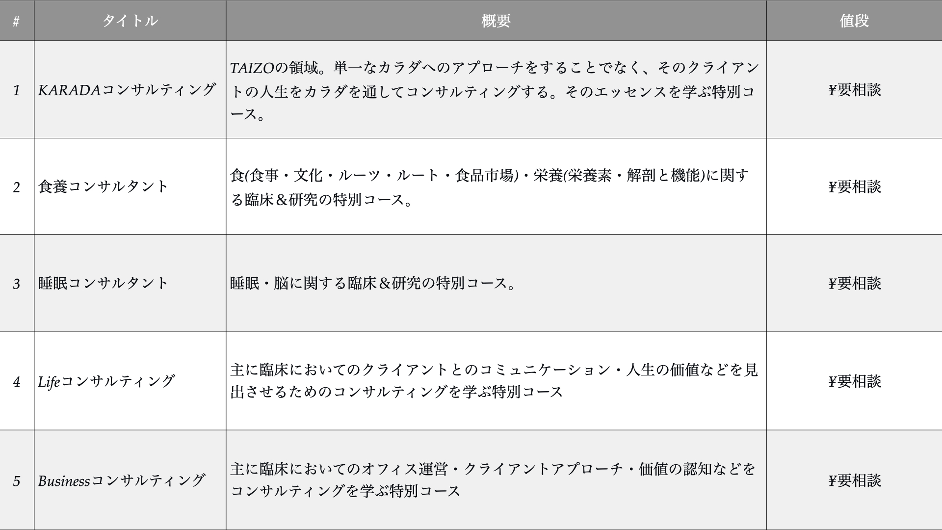 6.カラダコンサルタント – 最高峰の領域。ただ単にカラダのアプローチをすることでなく、そのクライアントの人生をカラダを通してコンサルティングする。トレーニング&治療のみでなく、包括的なカラダのありとあらゆる角度からアプローチできる。グローバルな視点、臨床歴20年以上、10万人以上のクライアントをみてきた方対象。